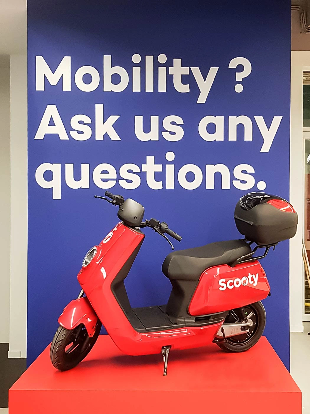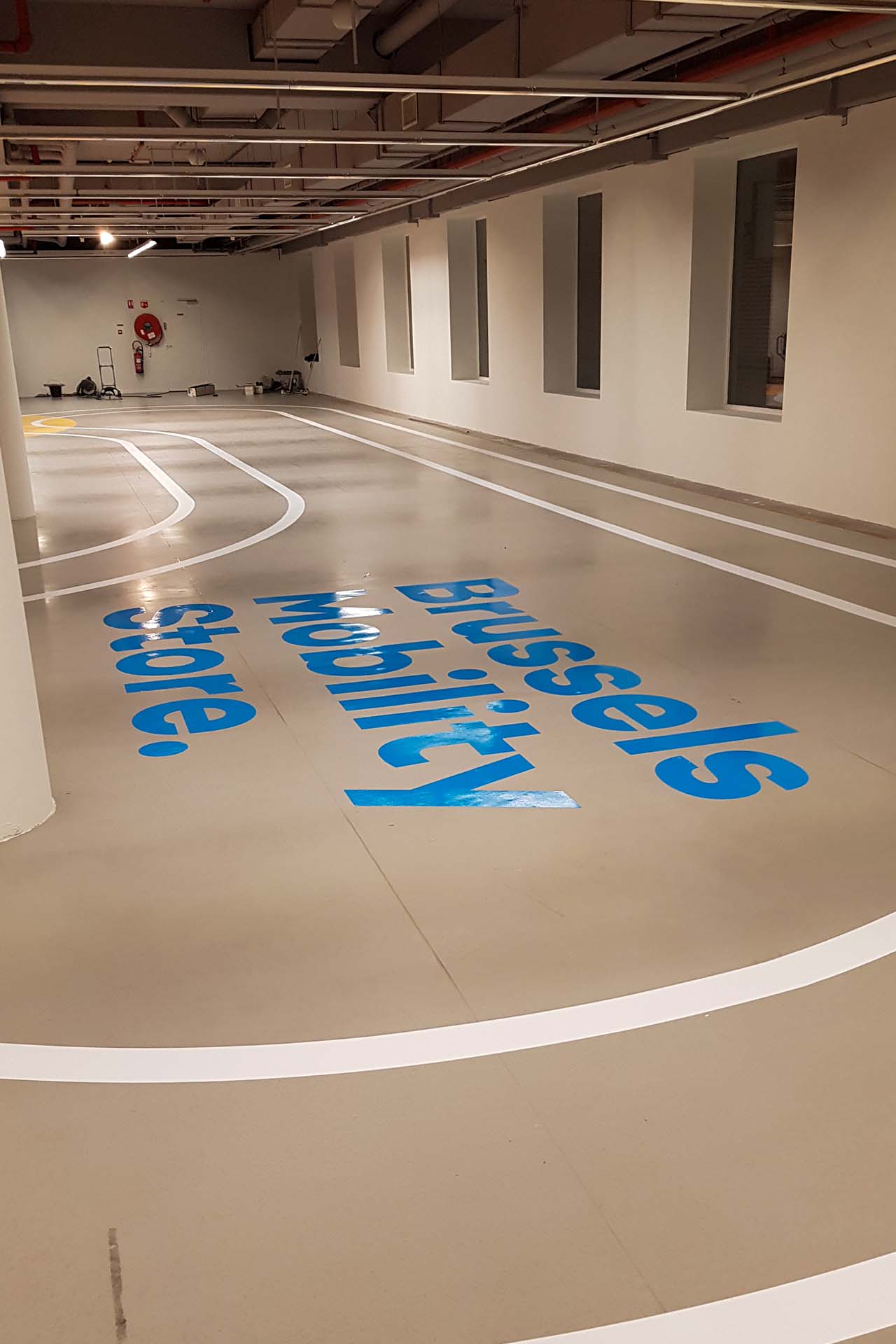 Signalétique intérieure en vinyle blanc mat, appliqué au mur. Circuit schématique de 30 m au sol pour tester des alternatives électriques. Lettrages intérieurs visibles de l’extérieur sous film bleu (1er étage).