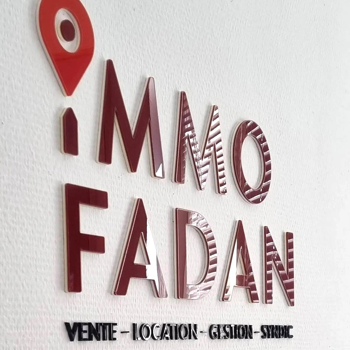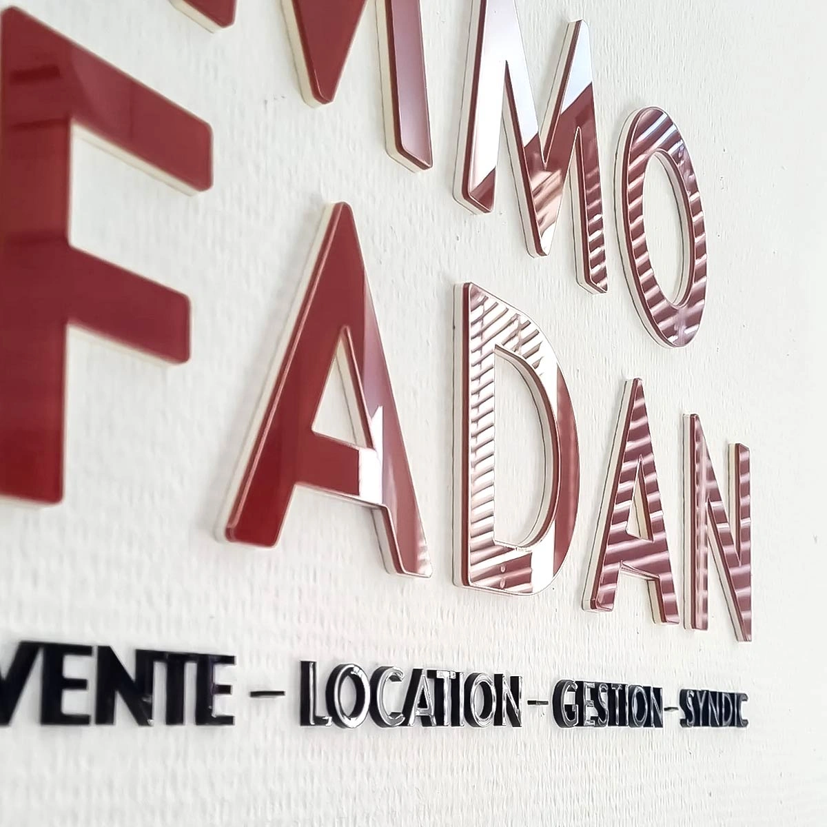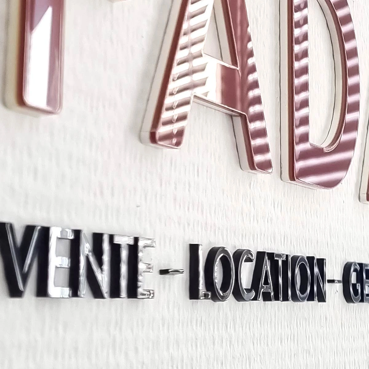 Lettrage en plexiglas imprimé et découpé, accompagné d’une enseigne équipée d’un éclairage rasant LED avec une portée de deux mètres.
