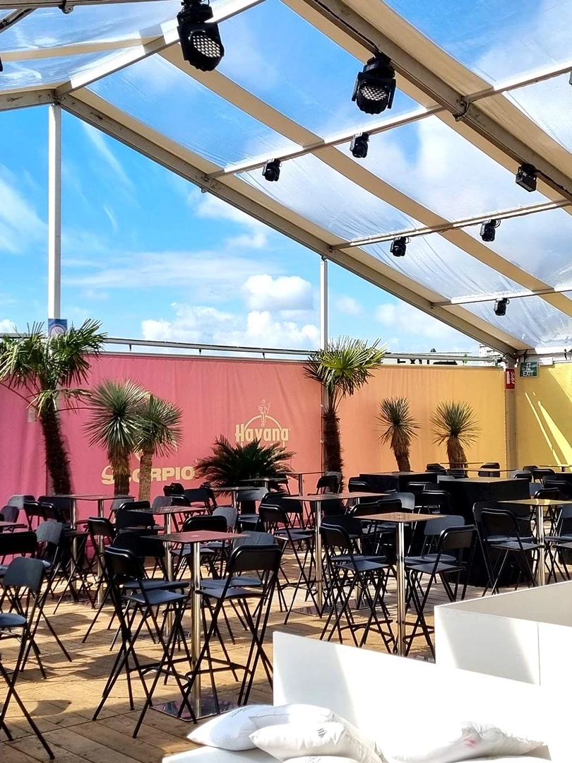 300 m² de bâches imprimées pour les soirées Scorpio (design Romain Garcin). Fixation discrète et efficace, sans œillets ni tendeurs.